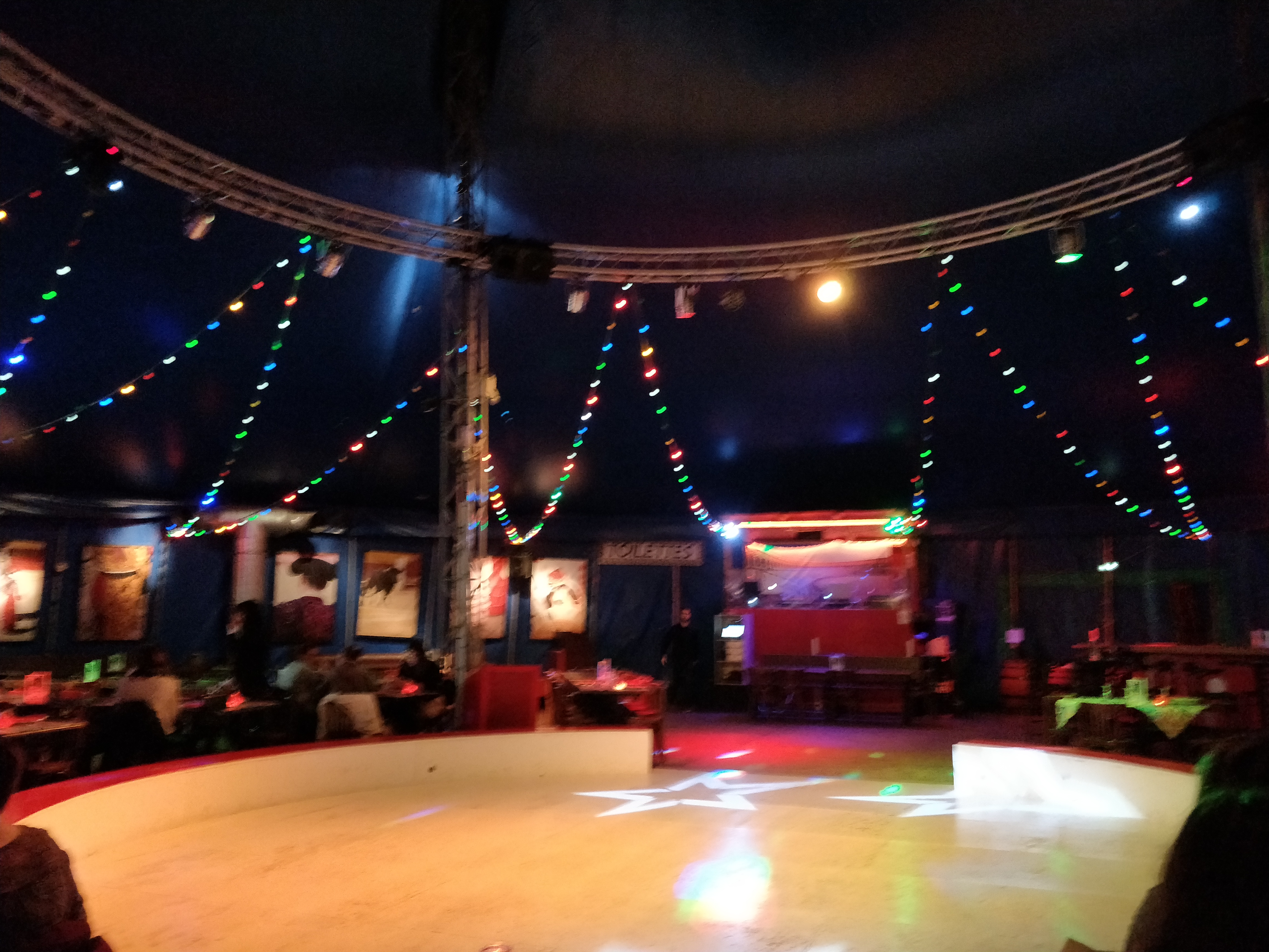 Restaurant dansant sous chapiteau. Agréable surprise : on y mange bien, la piste de danse, c'est la piste du cirque. 2 salles 1 principales et une autre plus en retrait, de la musique. Soirée à thème c'est sympa. Parking surveillé. Entrée contrôlée et un agent de sécurité en bord de piste pour éviter tous les débordements. On y fêtait un EVJF et franchement c'était top !